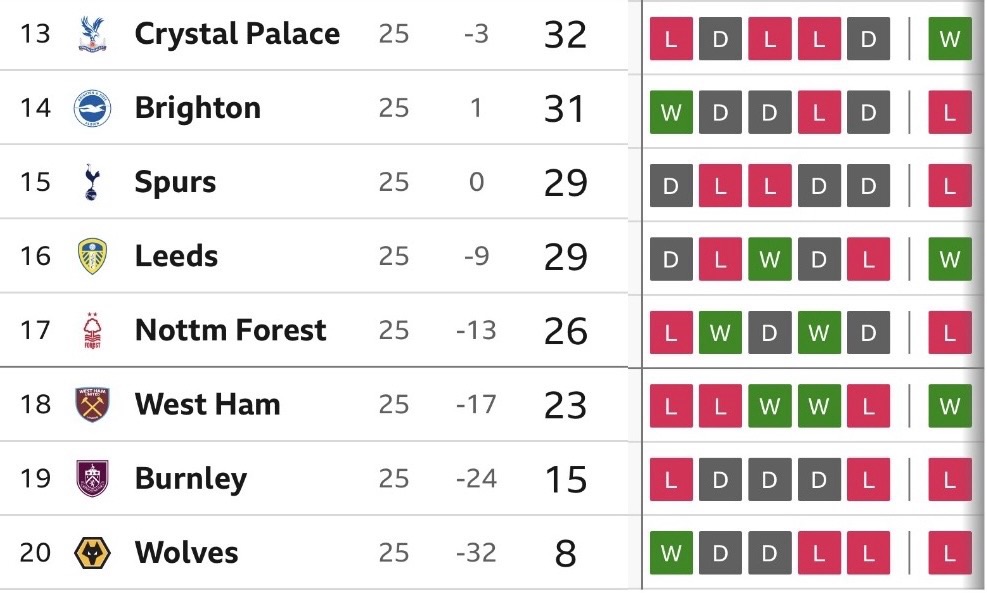 Three massive points won! The Hammers are now only three points behind Nottingham Forest. That’s what the bottom of the Premier League table looks like on Saturday evening: