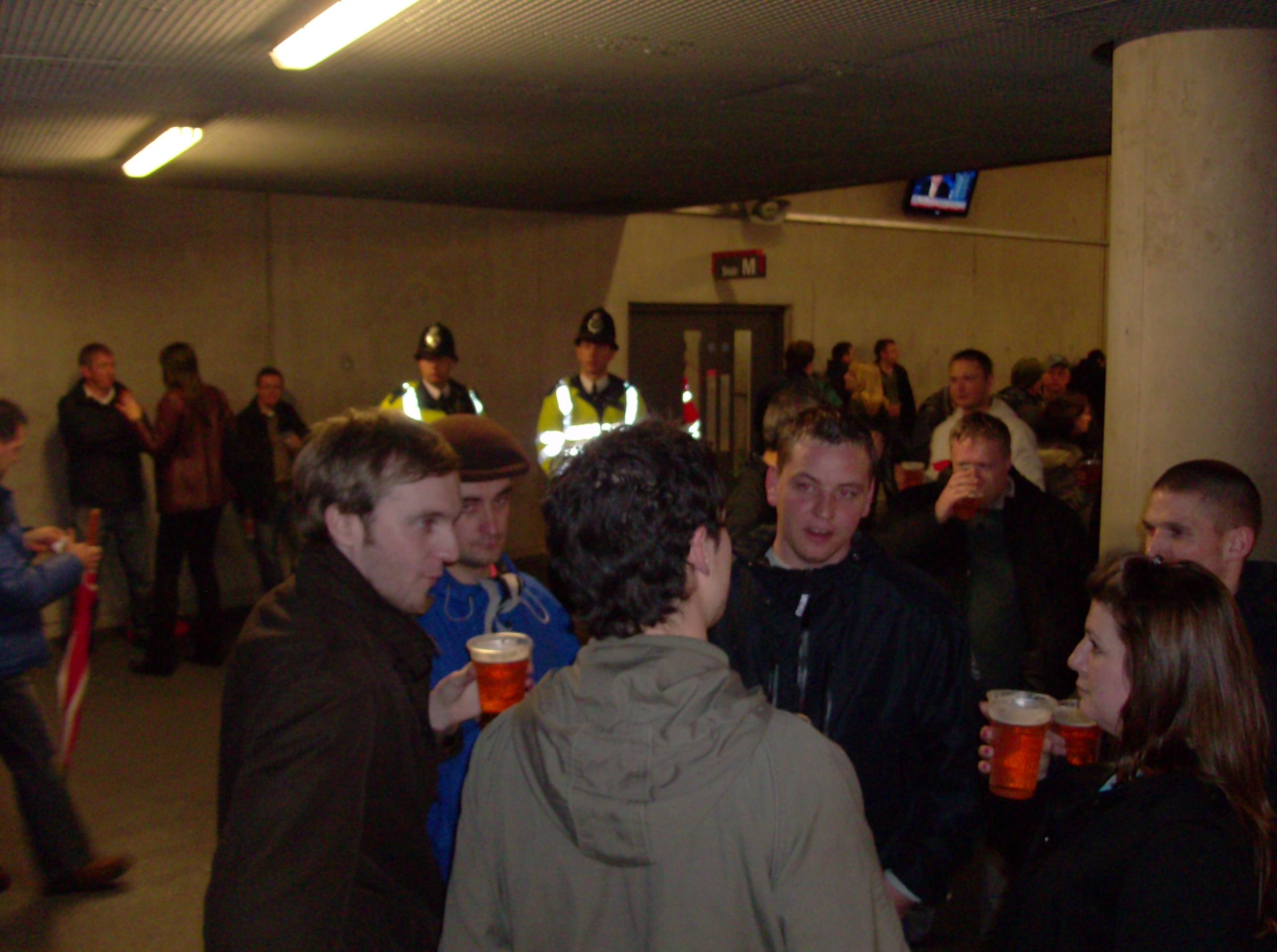 Bis kurz vor Spielbeginn ist die Tribüne fast leer, weil das Mitnehmen der Bierbecher nicht erlaubt ist. Flüssiges gibt es nur im düsteren und schmucklosen Betonbauch des „away ends“. Und während es draußen vor Anpfiff noch still ist wie in einer Bibliothek, ist in dieser Gruft schon der mächtige Widerhall von „We all follow the West Ham“ und „Bubbles“ zu hören.