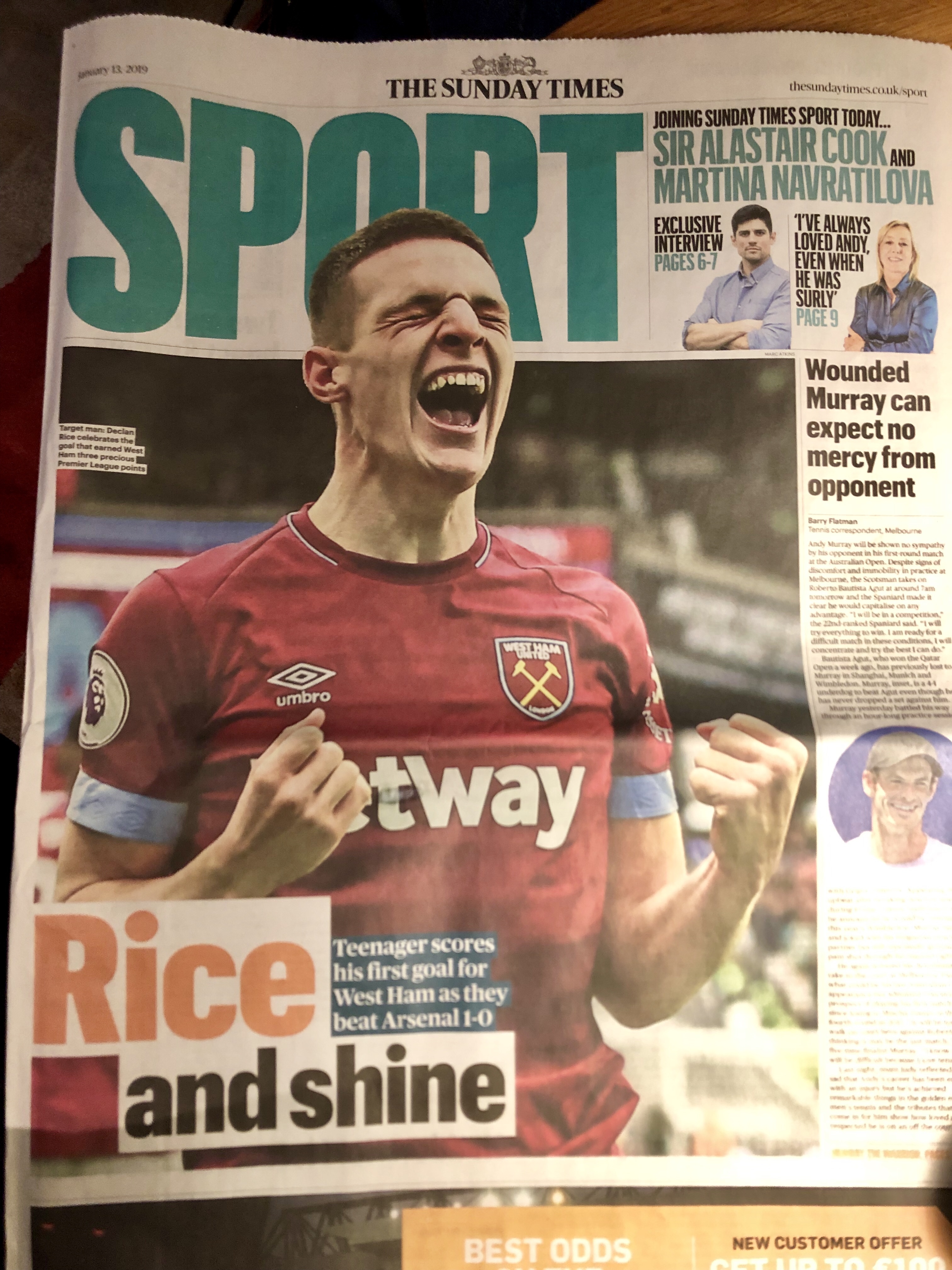 But forget about that! We’ve all witnessed a very different, really bright and joyous moment in West Ham’s history on Saturday lunch time. This game will not be remembered because of a forward saying good-bye, but will forever have its special place in the history books for a young man’s first Premier League goal which sealed a first win at home over Arsenal since 2006! It’s this game that marks an other giant step forward for Declan Rice grabbing all the headlines in the Sunday papers with a majestic man of the match performance, just two days before his twentieth birthday. “Rice and shine”! What a bright future lies ahead for this graduate from our Academy.