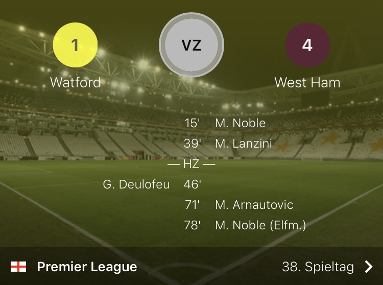 Mit einem 4:1-Auswärtssieg bei FA Cup-Finalist Watford samt Arnautovic-Goal konnte sich West Ham auf den 10. Endrang in der PL vorschieben. Den Endstand fixierte Mark Noble mit seinem zweiten Treffer (Elfmeter) in diesem Spiel. Einen weiteren Treffer steuerte Manuel Lanzini bei, für den die Saison damit sehr positiv endet, nachdem er sich ja in der WM-Vorbereitung mit Argentinien im Vorjahr schwer verletzt hatte. In der Tabelle überholten die „Hammers“ damit Watford.
