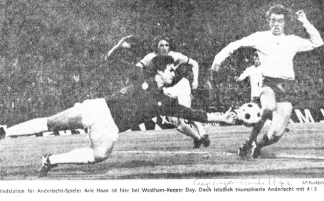 Therefore I also kept an eye on West Ham’s results and when the club won the FA Cup in 1975 and reached the 1976 European Cup Winners’ Cup Final, also the Hammers became one of the teams to watch! And that brings us back to the new home shirt, because the strip which served as a model for the 2019 claret home shirt (shoulders, upper part of the chest and sleeves in blue) was used from 1976 to 1980 and was first sported in the European Cup Winners’ Cup Final in Bruxelles against Anderlecht in May 1976. I watched this game on TV and I have kept a newspaper cutting of the match report showing then West Ham keeper Mervin Day and a West Ham defender who wore the new shirt.