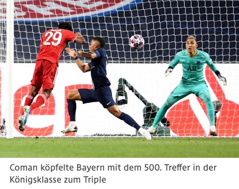 Das Goldtor, das gleichzeitig der 500. Bayern-Treffer in der Königsklasse war, erzielte Ex-PSG-Spieler Kingsley Coman (59.) per Kopf nach einer Maßflanke von Kimmich.