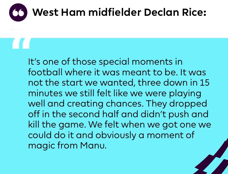 Die Hammers sind erst das dritte Team, dem das in der Geschichte der Premier League gelang: in der 80. Minute drei Tore zurück – und dann doch noch den Ausgleich geschafft! (Nur West Brom v Man Utd im Mai 2013, 5-5, und Norwich v Middlesbrough im Januar 2005, 4-4, ist das bisher auch gelungen.)