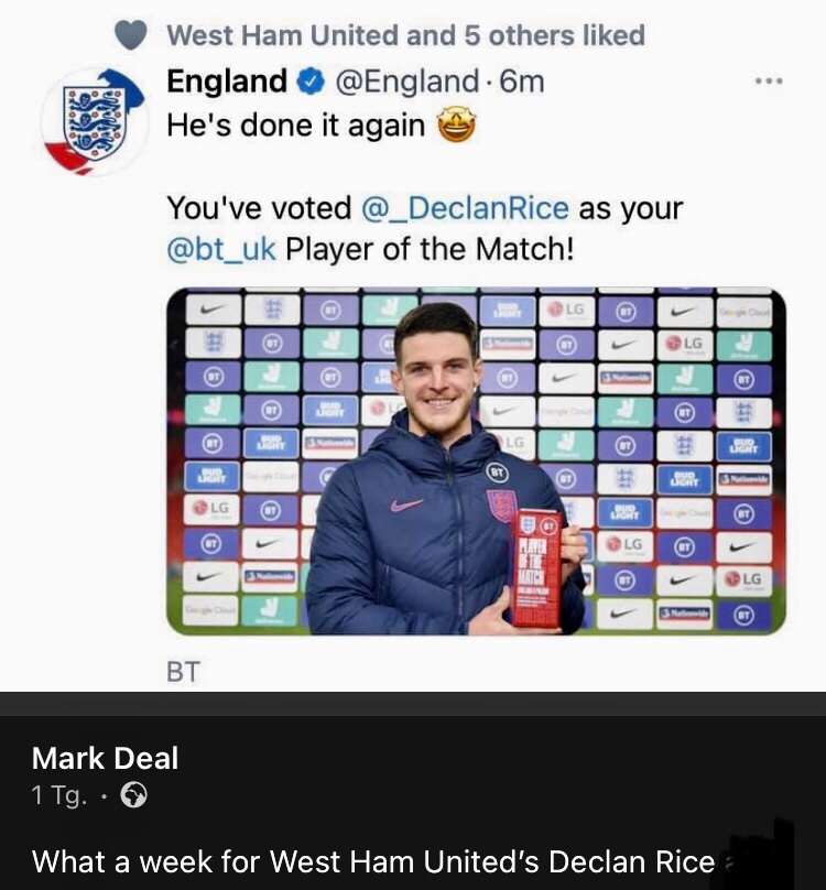 Ein weiteres London-Derby hätte man beinahe auch gewonnen: 3:0 führten die Irons am Sonntag schon gegen Arsenal (Lingard traf schon wieder, dann Bowen und Soucek), doch kamen die Gunners durch zwei Eigentore von West Ham auf 2:3 heran; Michail Antonio traf leider nur den Pfosten, Declan Rice schloss ein unglaubliches Solo aus der eigenen Hälfte mit einem Fehlschuss ab – und dann erzielte der FC Arsenal doch noch den Ausgleich – ein spannendes Match im London Stadium endete 3:3 (3:1).