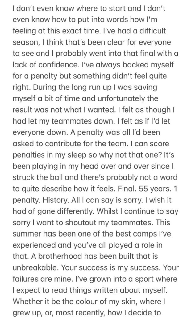 In his letter, Saka said he prays to God before every game and understands how his faith is tested each match.