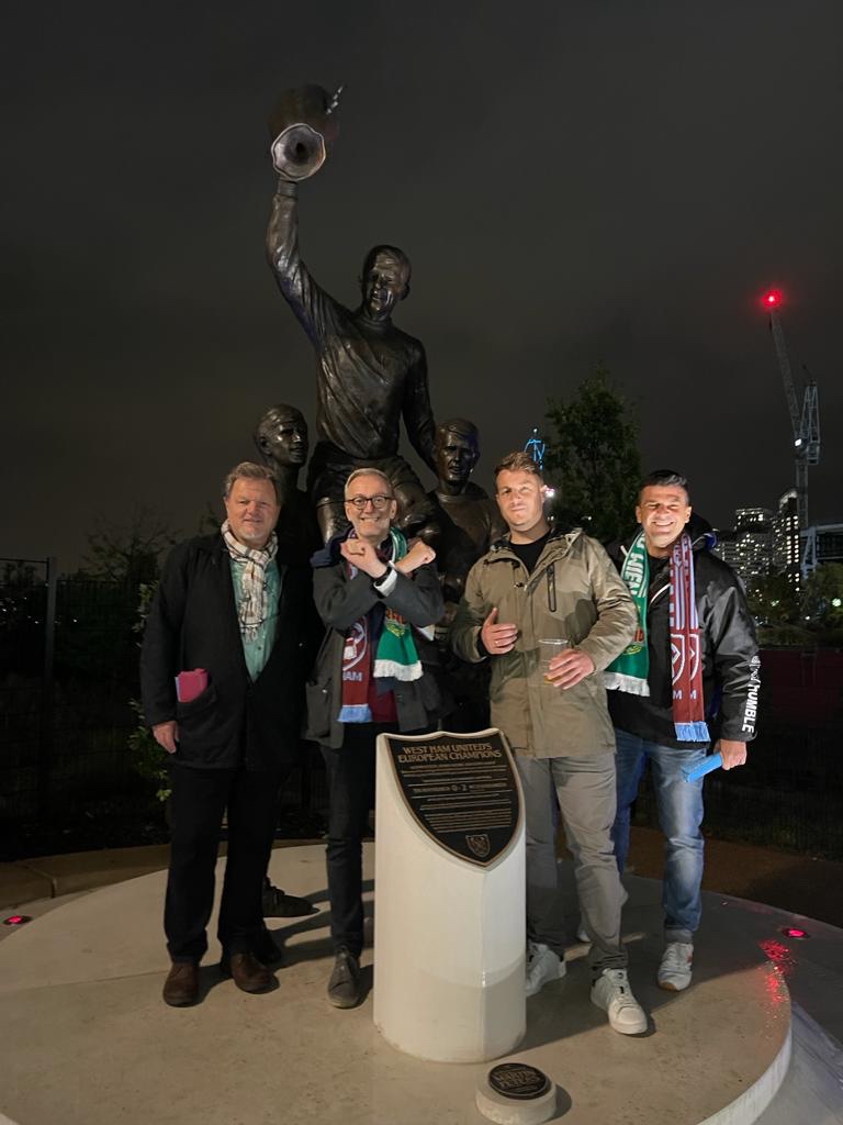 Alfred, RapidHammer, Simon und Rene (oben v.l.n.r.) vor der neuen Statue mit West Ham’s Europacup der Cupsieger-Gewinnern 1965, Geoff Hurst, Bobby Moore und Martin Peters, an einem denkwürdigen Fußballabend im London Stadium: