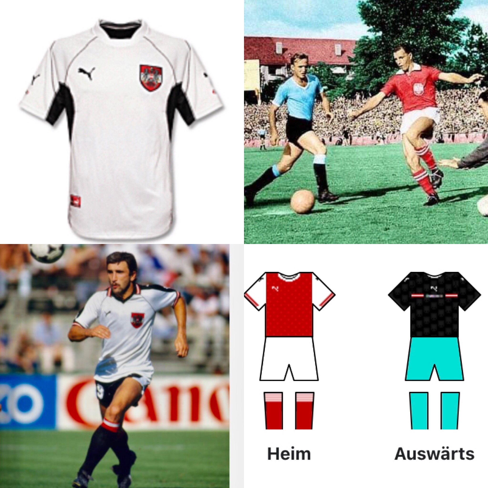 Die rot-weiß-roten Farben der österreichischen Flagge waren in dieser Zeit nur jene des Auswärtstrikots (oben rechts: Österreich bei seinem größten Erfolg, dem 3:1 über Uruguay im “kleinen Finale” bei der WM 1954), bis der von 2002 bis 2005 amtierende österreichische Teamchef Hans Krankl (Bild oben links als Spieler in Weiß-Schwarz) das Auswärtstrikot zum Heimtrikot machte.