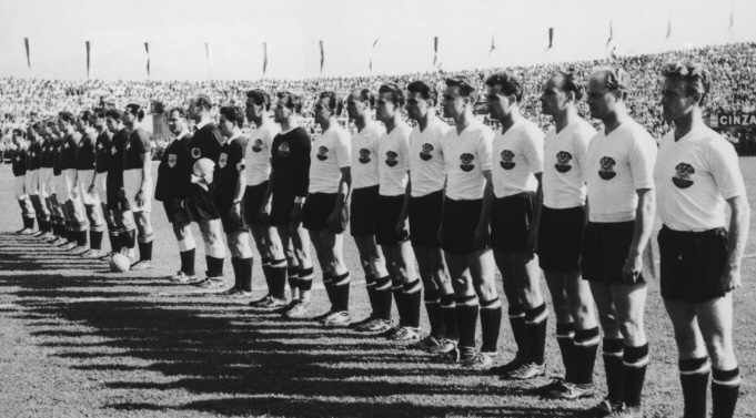 Schweiz – Österreich bei der WM 1954 (Österreich gewann in den traditionellen weißen Leibchen und schwarzen Hosen und Stutzen die „Hitzeschlacht von Lausanne“ 7:5)