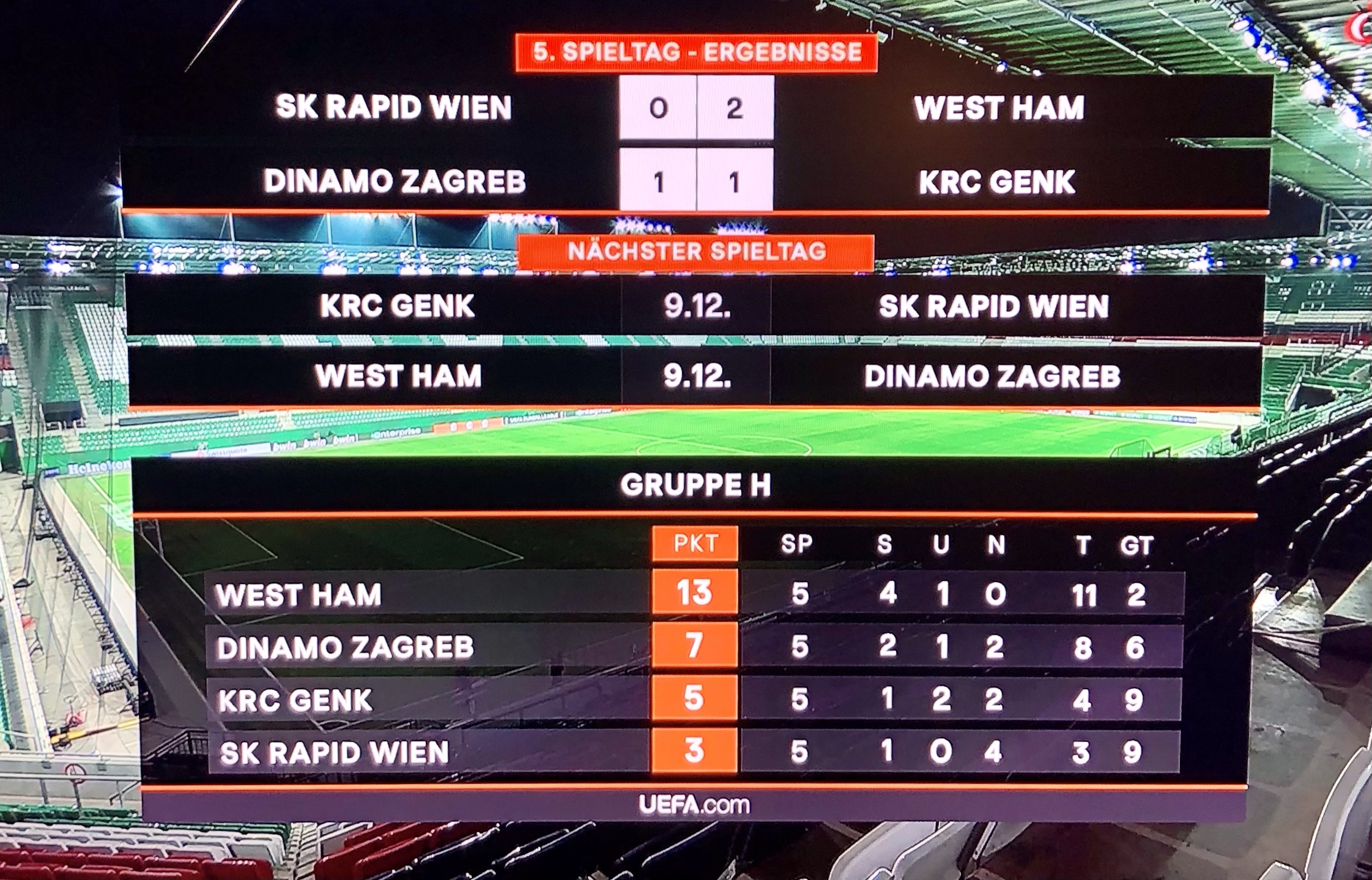 Is a shock result on the cards in this fixture now with David Moyes rotating his squad and Rapid having got a new (caretaker) manager in Steffen Hofmann, Rapid’s so-called “football god” being the green and whites’ record player with a total of 540 appearances for Rapid, after Didi Kuehbauer had to resign due to a bad run of results in the Austrian Bundesliga? Or will West Ham, as I also hope, already secure their place in the knockout stages in Vienna? We will know on Thursday evening, though unfortunately we will not be eye-witnesses of this event and cannot cheer on the teams in the Allianz Stadion aka Weststadion in Huetteldorf.
