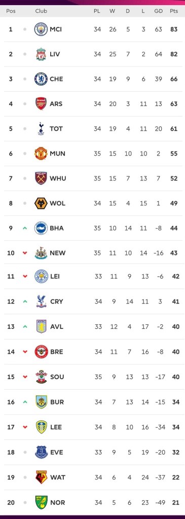 Drei Runden – und einige Nachtragsspiele in “midweek“ – sind in der Premier League noch zu spielen. Wirklich spannend ist der Kampf um den Titel (Manchester City und Liverpool trennt nur ein Punkt) und um den vierten Champions League-Platz (Arsenal vs. Tottenham mit einem direkten Duell am 12. Mai). Und auch zwei von den drei Absteigern stehen noch nicht fest (wobei Watford wohl nur noch theoretische Chancen auf einen “great escape” hat und es zusätzlich einen aus dem Trio Everton, Leeds und Burnley erwischen wird).