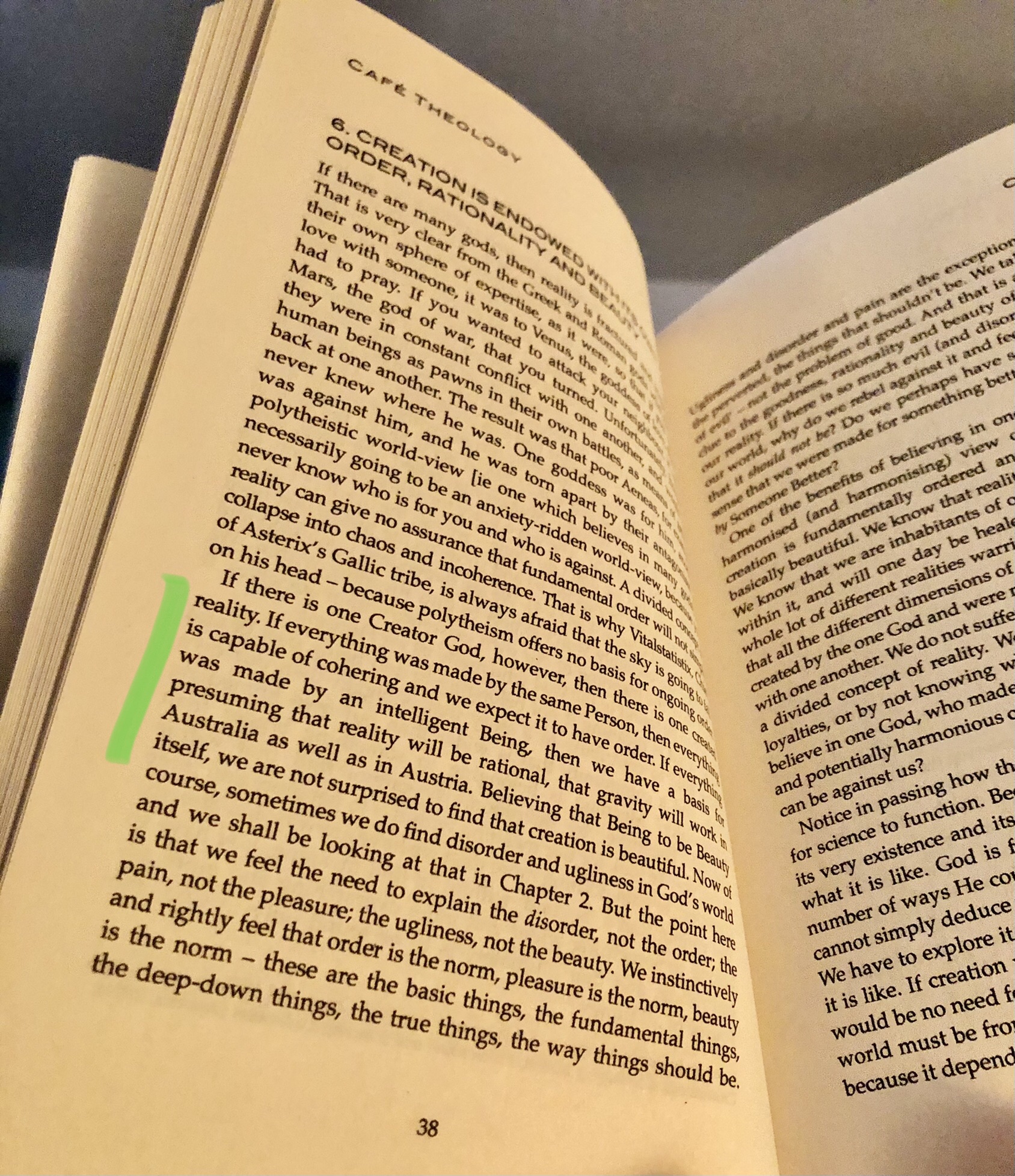 “If there is one Creator God, then there is one created reality. If everything was made by the same Person, then everything is capable of cohering and we expect it to have order. If everything was made by an intelligent Being, then we have a basis for presuming that reality will be rational, that gravity will work in Austria as well as in Australia. Believing that Being to be Beauty itself, we are not surprised that creation is beautiful.”