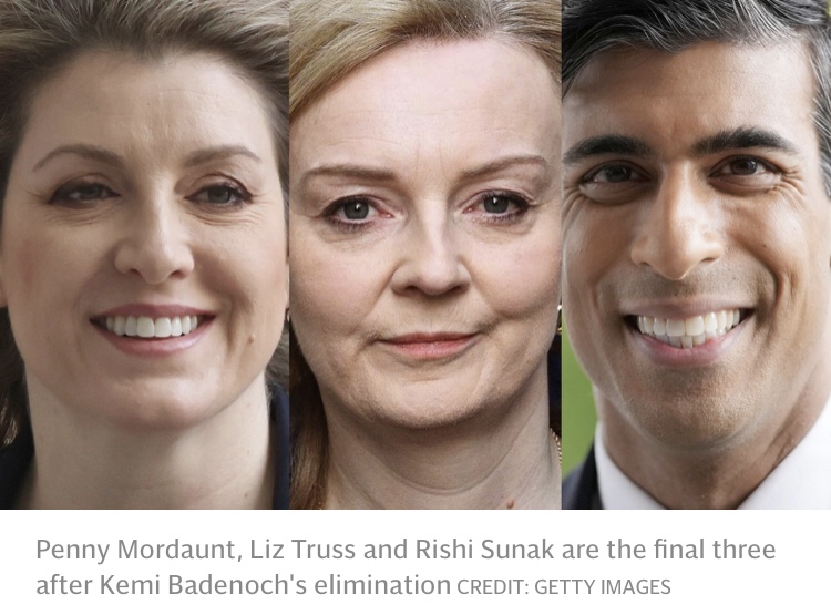 - Leadership candidates Rishi Sunak, Penny Mordaunt and Liz Truss face a final vote by Conservative MPs at 13:00 -15:00. The result is expected at 16:00