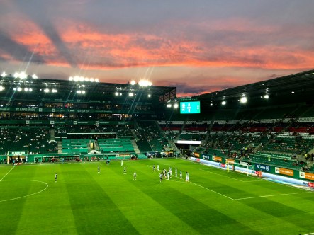 Was für eine schöne Abendstimmung, als die Sonne hinter der Westtribüne im Allianz Stadion untergeht. Weniger schön ist dagegen der Endstand des Spiels gegen Gdańsk – nur 0:0 im Hinspiel der 2. Qualifikationsrunde für die Europa Conference League.