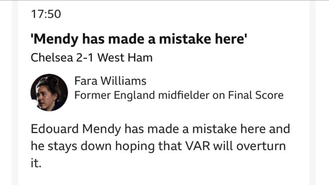 After the VAR check West Ham’s goal is disallowed by referee Andrew Madley and Bowen is penalised for a foul on the Chelsea keeper: he just caught Mendy’s arm with his studs as he hurdled him, but contact was minimal.