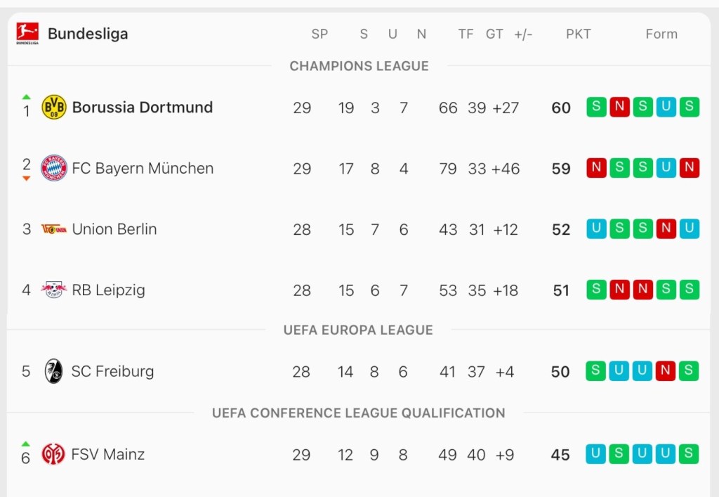 Was am Samstag Borussia Dortmund gelungen ist, könnten am Sonntag mit einem Sieg auch die „Blackies“ aus Graz schaffen: die Tabellenführung zu übernehmen. Gestern verloren die Bayern in Mainz 1:3, und da der BVB die Eintracht Frankfurt mit 4:0 besiegte, lachen die Borussen nun fünf Spiele vor Saisonende mit einem Punkt Vorsprung von der Tabellenspitze.