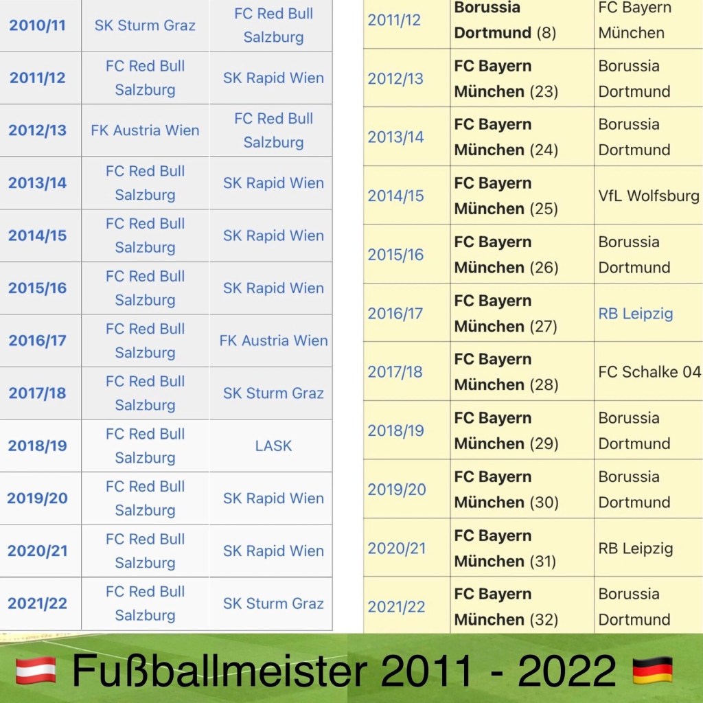 Die Liste der österreichischen Fußballmeister der Männer weist seit 2013/14, jene der deutschen sogar schon seit 2012/13 immer die selben Klubs aus. Die nur eineinhalb Reisestunden von einander entfernten Städte Salzburg und München konnten seit neun bzw. sogar seit zehn Jahren Jahr für Jahr über den Fußballmeistertitel jubeln. Damit könnte es heuer ein Ende haben, denn die Bayern schwächeln trotz des Trainerwechsels von Nagelsmann zu Tuchel weiter und Red Bull Salzburg liegt nach zuletzt zwei Unentschieden nur noch zwei Zähler vor dem ersten Verfolger Sturm Graz, gegen den sie am Sonntag im direkten Duell in Graz antreten.