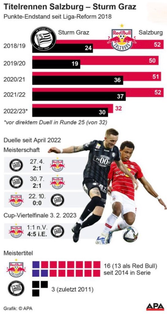 In Österreich steht am Sonntag das direkte Duell Sturm – RBS auf dem Programm, und aufgrund der Punktehalbierung anlässlich der Teilung der Bundesliga in Meister- und Relegationsgruppe und zuletzt zwei Unentschieden der Salzburger könnten die „Blackies“ bei einem Sieg die „Bullen“ überholen. Wenn man am Sonntag gewinnt, dann würden die Grazer die Führung in der österreichischen Bundesliga-Tabelle übernehmen und sechs Runden vor dem Meisterschaftsfinish wie der BVB ein Pünktchen vor dem Serienmeister liegen!