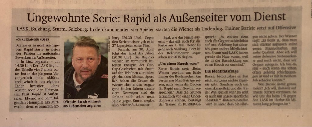 “In Linz beginnt’s”, heißt es – gemeint war in diesem Fall in einem Artikel im KURIER vor einer Woche eine Serie von (zumindest) vier Spielen, in denen der SK Rapid sowohl in der Meisterschaft als auch im Cup als “Underdog” ins Rennen gehen würde.