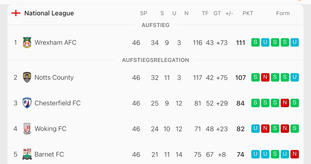 Mit einem 1:1 in Torquay beendete der AFC Wrexham am Samstag die Saison als Meister der National League und steigt mit vier Punkten Vorsprung auf Notts County nach 15 Jahren endlich wieder in die English Football League (League Two) auf! Torquay, das Team aus dem südenglischen Seebad, das ich 1976 auf meiner ersten England-Reise besuchte, muss als Viertletzter in die National League South absteigen.