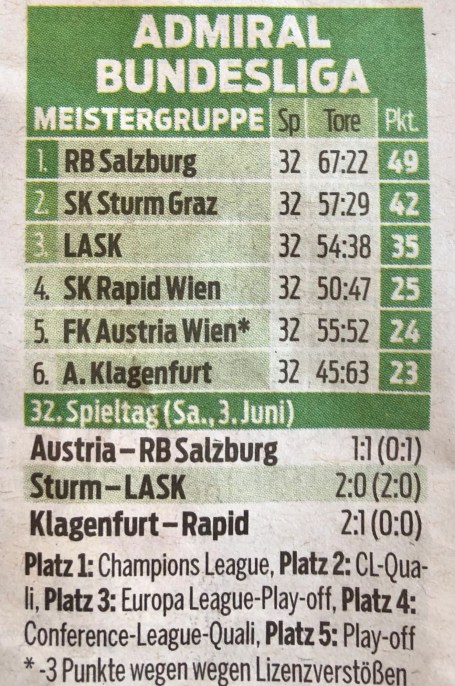Wie die Hammers am letzten Weekend verlor auch der SK Rapid an diesem Wochenende sein letztes Meisterschaftsspiel mit 1:2. Da die Austria aber zeitgleich nur 1:1 gegen Salzburg spielte, kurz vor Schluss noch eine Riesen-Siegeschance vergab und mit minus drei Punkten in die Saison hatte starten müssen, bleiben die Grün-Weißen auf Platz 4 und ersparen sich das österreichische Europacup-Play-off. Sie starten dann am 10. August in die Conference League-Quali.