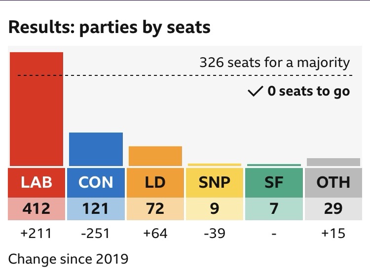 Labour has won a big majority of seats in the House of Commons in the July 4th general election. Great Britain voted for change and put paid to 14 years of Tory majority.