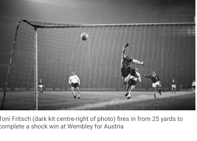Aged 20, he was a promising striker for Rapid Vienna but would have been almost completely unknown to English football fans until he scored twice in five minutes as Austria beat England, twice coming from behind, 3-2 (0-1) on 20 October 1965 at Wembley, highlights available thanks to British Pathé.