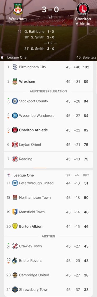 The season is nearing its end in the English Football League. Wrexham gained back-to-back promotions with a 3-0 win over Charlton at their Racecourse Ground on Saturday. With this victory Wrexham secured second place in League One behind Birmingham and will play in the Championship next season.