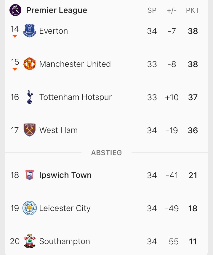 In the Premier League West Ham lost 2-3 at Brighton the same afternoon, but with Ipswich also being defeated by Newcastle, the Hammers are safe from relegation despite not having won in two months or seven games now. Being on only 36 points from 34 games is very disappointing for the east London side , but with a derby against Tottenham ahead, the Hammers could still climb up the table next weekend if they beat Spurs.