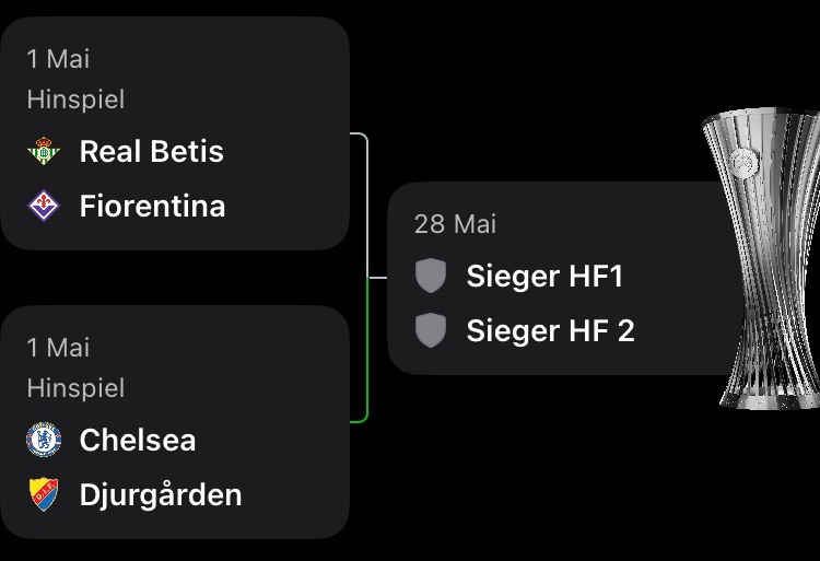Dennoch sollte man bekanntlich nie allzu sicher sein im Fußball. Es steht weder fest, “ob” noch “wann” man in London gegen Chelsea spielen wird. An sich hätten laut “Turnierbaum” die “Blues” zuerst Heimvorteil, wenn aber Tottenham in der Europa League mit einem Sieg gegen Frankfurt aufsteigen sollte (Hinspiel 1:1), würden die Spurs ihr erstes Semifinale zu Hause in London spielen. Dann müsste Chelsea auf dem Weg zu dem einzigen Titel, der in der beeindruckenden Sammlung der Londoner noch fehlt – denn die Conference League hat man im Gegensatz zu West Ham noch nie geholt – aufgrund der “city rule” der UEFA am 1. Mai zuerst auswärts antreten.