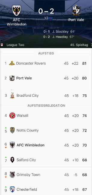 In League Two Wimbledon lost at home to Port Vale that have secured automatic promotion to League One with this win. Wimbledon is going to play Grimsby Town next week and must not lose this last game of the campaign if they want to keep their place in the play-offs.