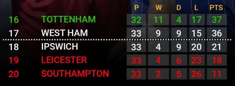 UPDATE: Following a 0-4 defeat against Arsenal on Sunday, Ipswich Town now 𝗠𝗨𝗦𝗧 win their last five Premier League games and hope West Ham United lose their last five fixtures to avoid relegation to the Championship. (The Tractor Boys have only won four games all season.)