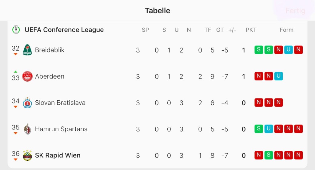 Rein rechnerisch ist der Aufstieg noch möglich, die nächsten Gegner sind voraussichtlich auch schwächer als die ersten drei. Aber wahrscheinlich ist, dass diesem Rapid-Team, in dem es leider viele Verletzte und auch manche, die für den Europacup einfach nicht gut genug sind, gibt, die Conference League vor dem Jahreswechsel abhanden kommt.