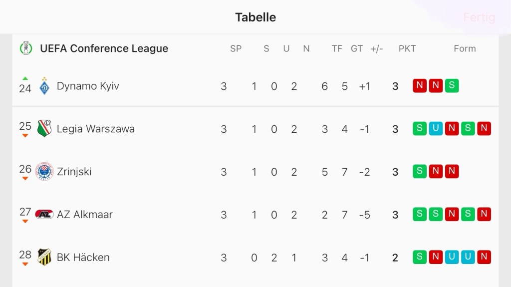 Ganz im Gegensatz zum Vorjahr, als die damals von Robert Klausz trainierte und viel besser eingespielte Mannschaft unter die ersten Acht der Conference League-Tabelle kam, krebst Peter Stögers von Verletzungen geplagtes Team aktuell ganz unten am Tabellenende herum und ein Weiterkommen, das zumindest das Erreichen von Platz 24 voraussetzen würde, scheint eine nur mehr theoretische Möglichkeit zu sein…