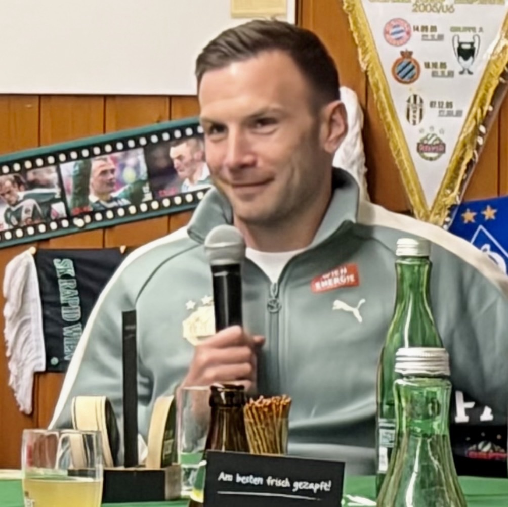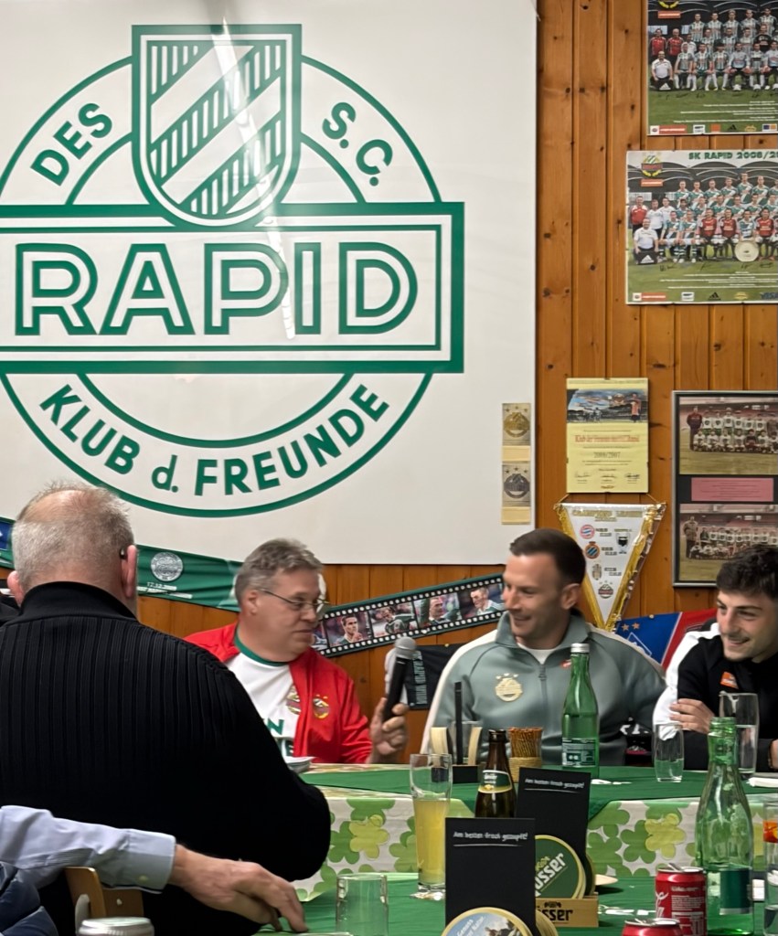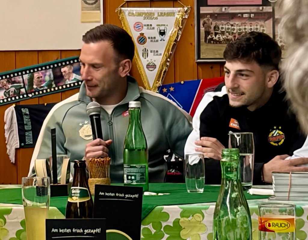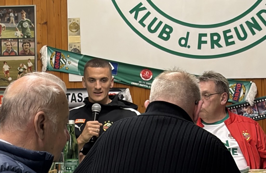 Furkan Demir kam später zum Fanklub-Treffen, weil er im Ramadan erst nach 18 Uhr essen durfte und erst nach dem „Iftar“-Mahl nach Meidling fahren konnte. Er steht beim nun seit zehn Wochen im Amt befindlichen neuen Trainer Johannes Hoff Thorup nicht mehr in der Startelf, gibt aber trotzdem alles im Training, glaubt an seine Chance und machte einen sehr positiven Eindruck. Sein im Winter nach Stationen bei Barcelona, Galatasaray und Basel zu Rapid zurückgekehrter älterer Bruder Yusuf ist aktuell verletzt; es kann also noch etwas dauern, bis wieder ein Demir für Grün-Weiß auflaufen wird.