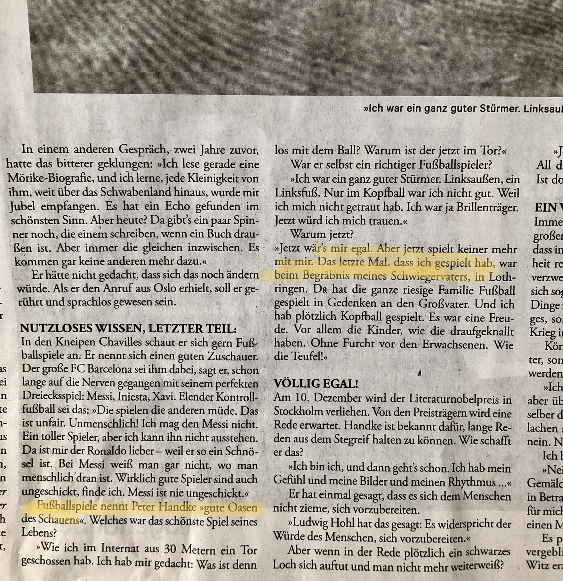 Fußballspiele nennt Peter Handke “gute Oasen des Schauens”, und in der ZEIT erzählt er unter anderem begeistert davon, wie beim Begräbnis seines Schwiegervaters die ganze Familie gemeinsam Fußball gespielt habe. (Die Zeit vom 17.10.2019; Bild unten)